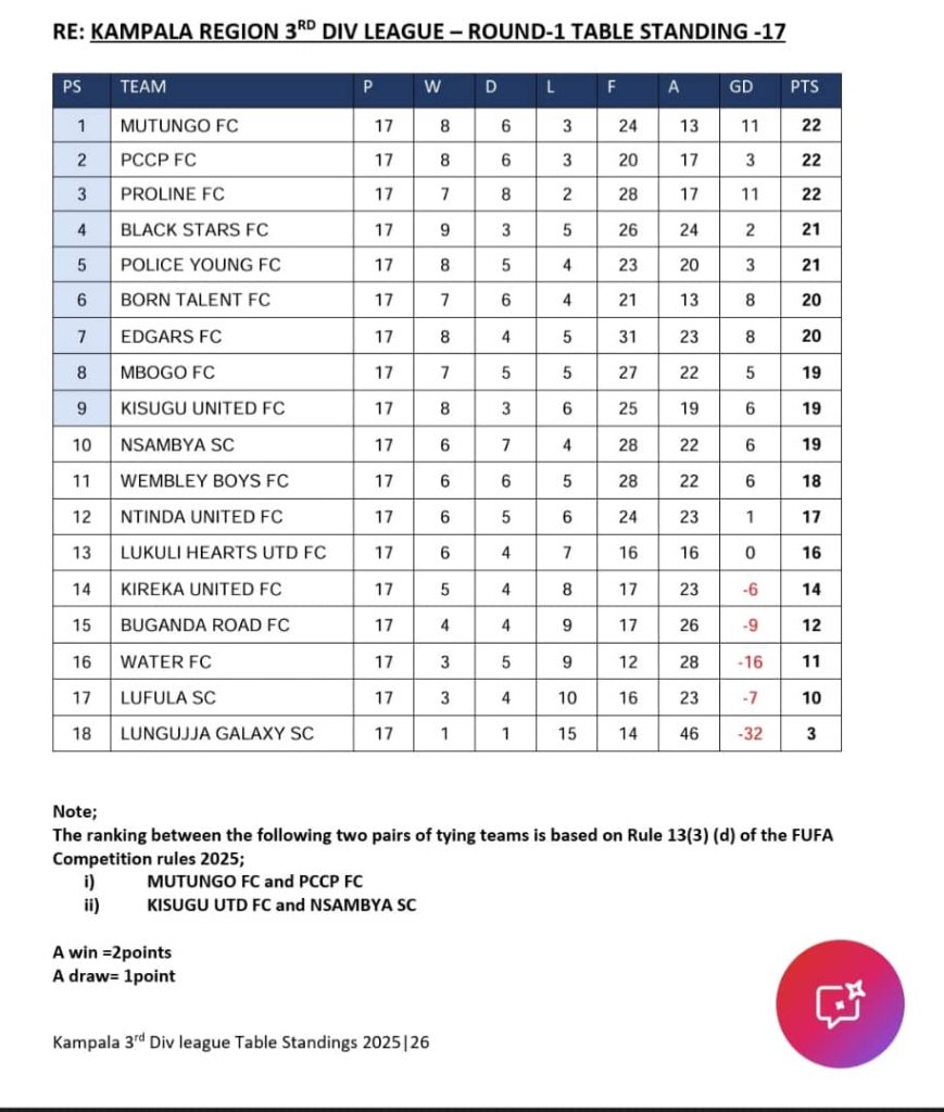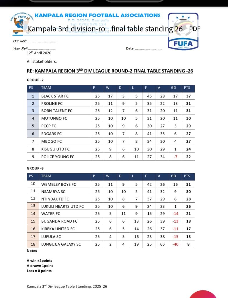The six teams competing in Group 4 are Edgars FC, Mutungo Proline FC, Black Stars, Born Talent FC, PCCP FC, and Proline FC. Black Stars FC from Kampala District Football Association finished top of Group 2, and the team with the most points in Group 4 will be crowned Kampala Region League champions for the 2025-26 season.