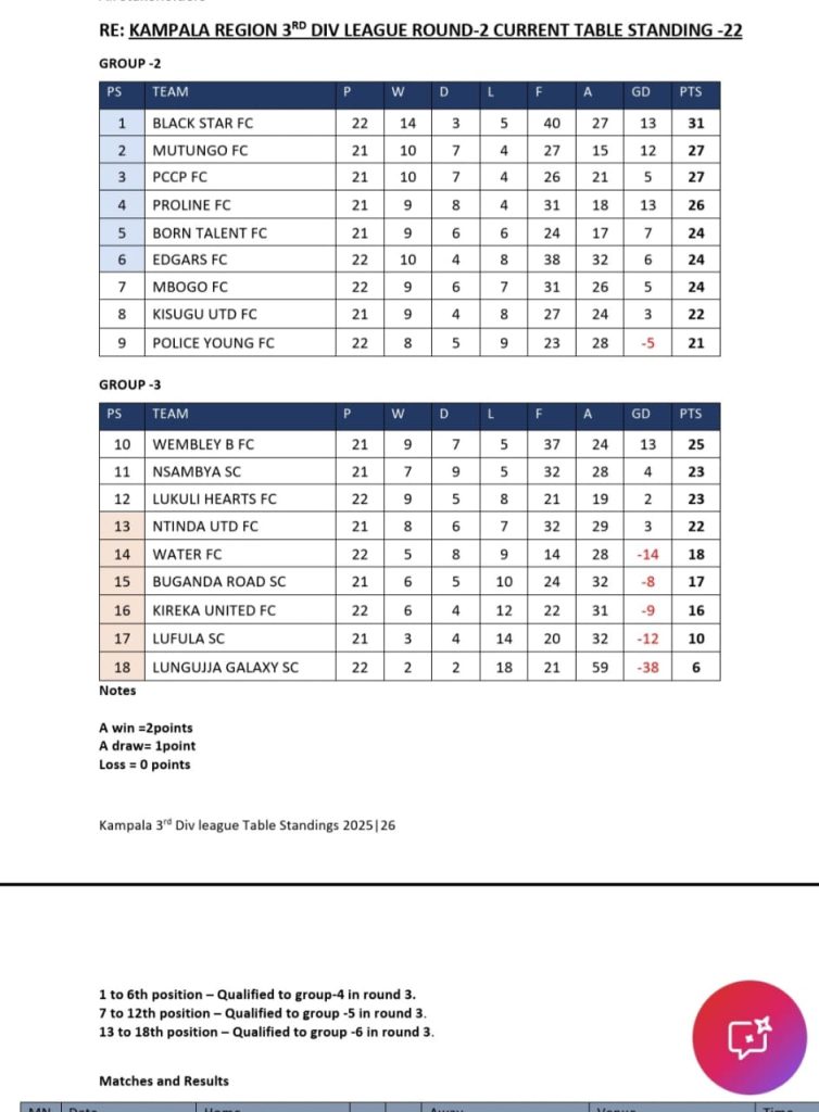 Black Stars FC secured a narrow 1-0 win over Mutungo FC, thanks to Benon Lutaaya’s 61st-minute strike. This is Black Stars FC’s fifth straight victory, and they sit on top of Group 2 with 31 points.