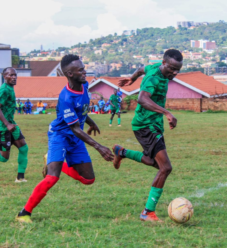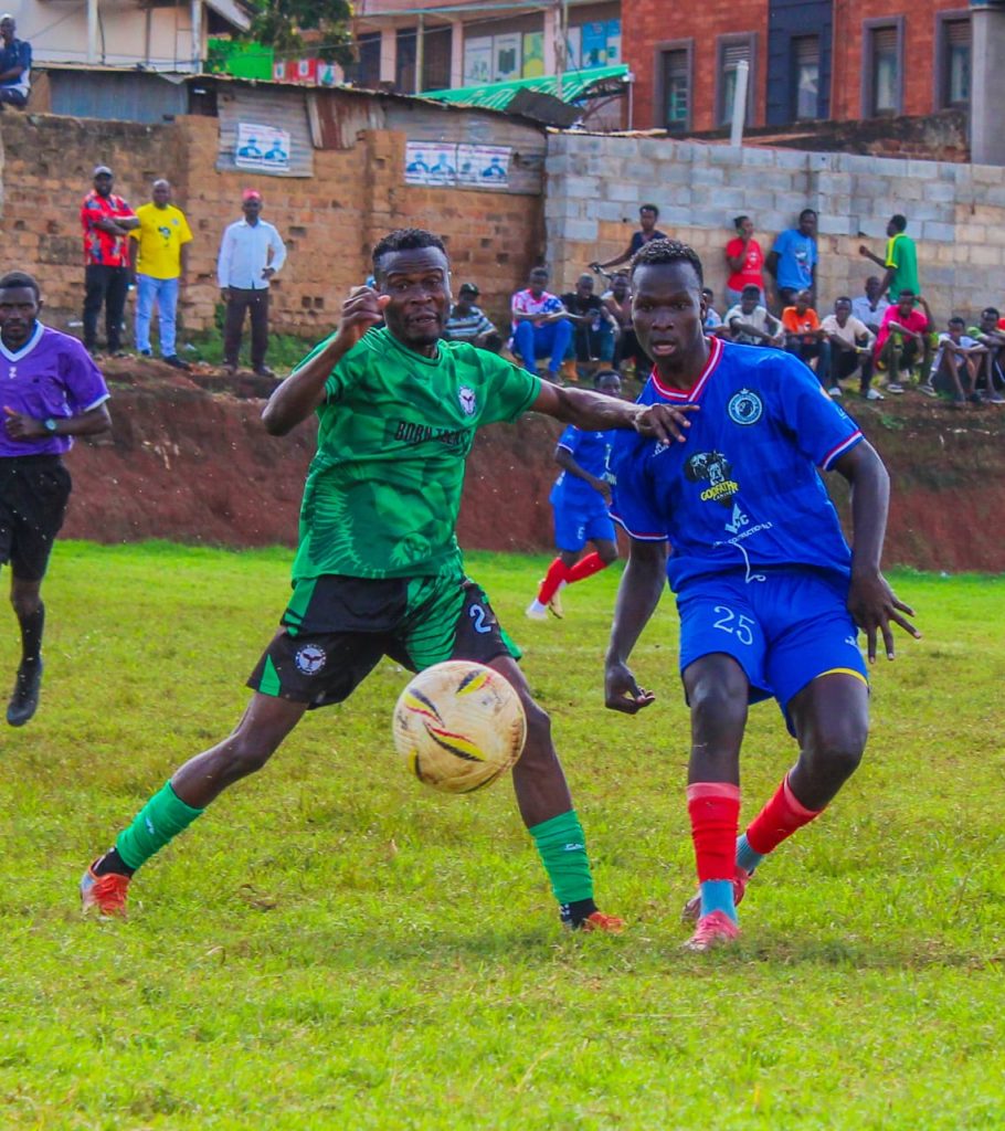 In action , Fred Byekwaso Born Talent FC defender battling for the ball with Kisugu United FC’s winger Bruno Mukwaya.