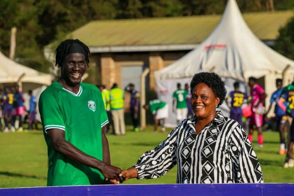 Woman MP, Enid Origumisiriza handing over The Macro Hardware Player of the Match, Dominic Abonga credit to Kigezi HomeBoyz FC