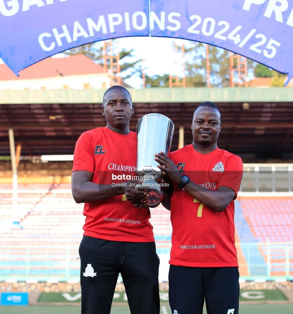 Coach John Luyinda Ayalla and Fred Muhumuza lifting the Uganda Premier League title .