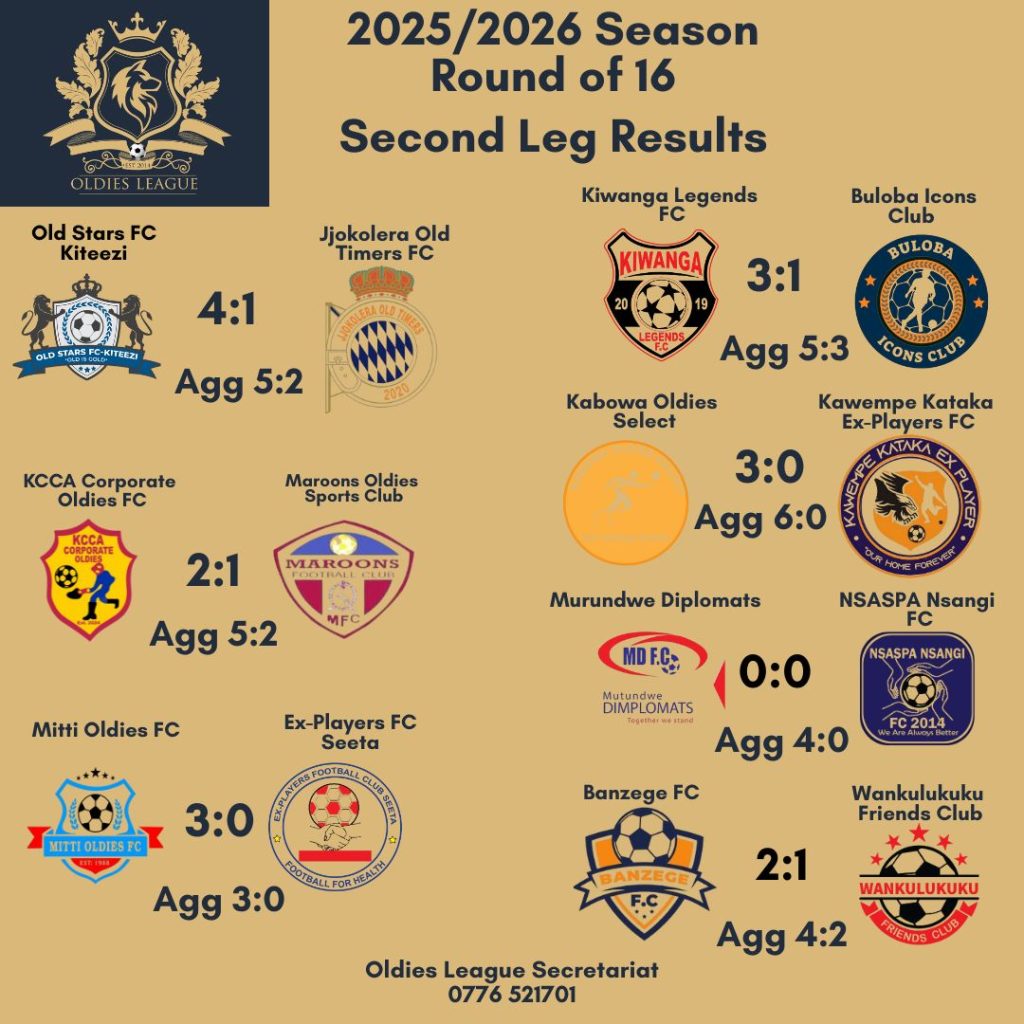 Kabowa Oldies, Mutundwe, Banzege FC, and KCCA Corporate Oldies FC also made it to the quarter finals with impressive wins. Kabowa Oldies defeated Kawempe Kataka 3-0, Mutundwe drew 0-0 with NSASPA Nsangi FC but progressed 4-0 on aggregate, Banzege FC won 2-1 against Wankulukuku Friends Club, and KCCA Corporate Oldies FC beat Maroons FC 2-1.