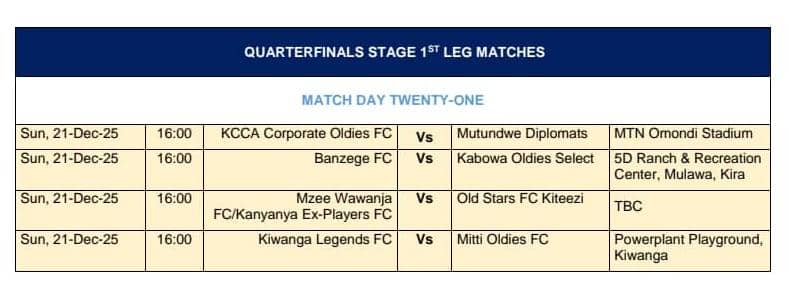 Kiwanga Legends will face Miti Oldies FC at Power Plant playground on December 21 in the first quarterfinal match.