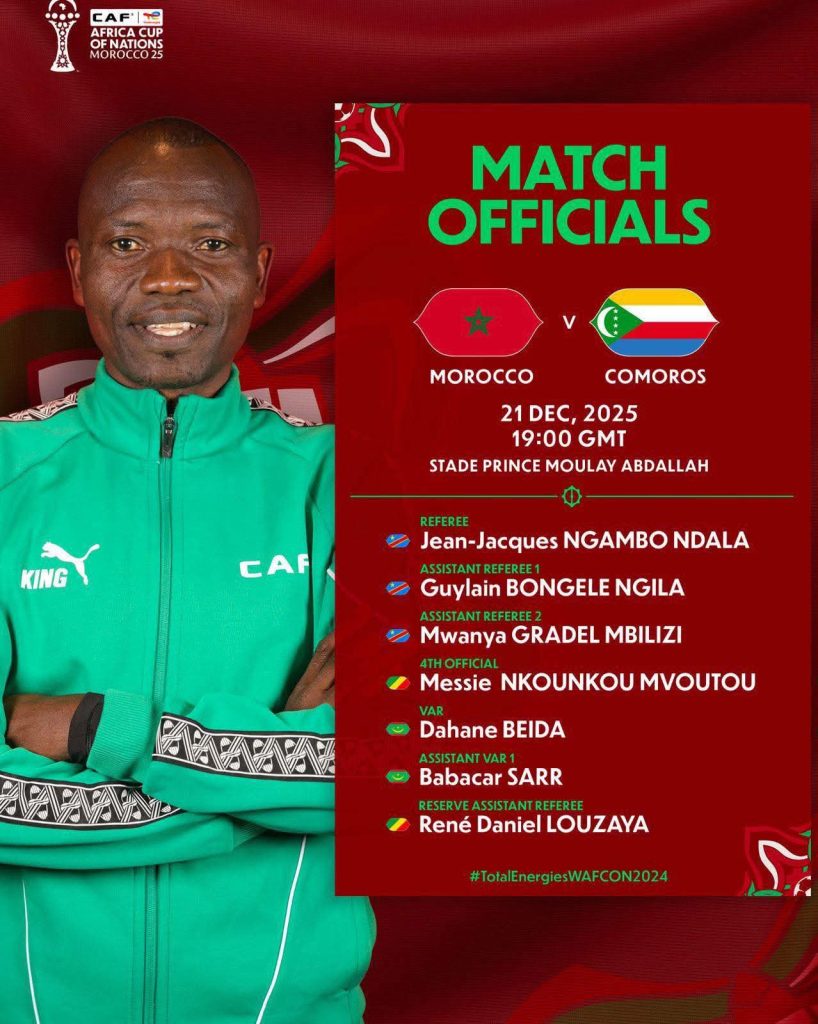 Jean-Jacques Ndala will be assisted by Guylain Bongele Ngila and Mwanya Gradel Mbilizi as the first and second assistant referees, respectively, while Messie Nkounkou Mvoutou serves as the fourth official for the opening match of the 2025 Africa Cup of Nations between Morocco and Comoros