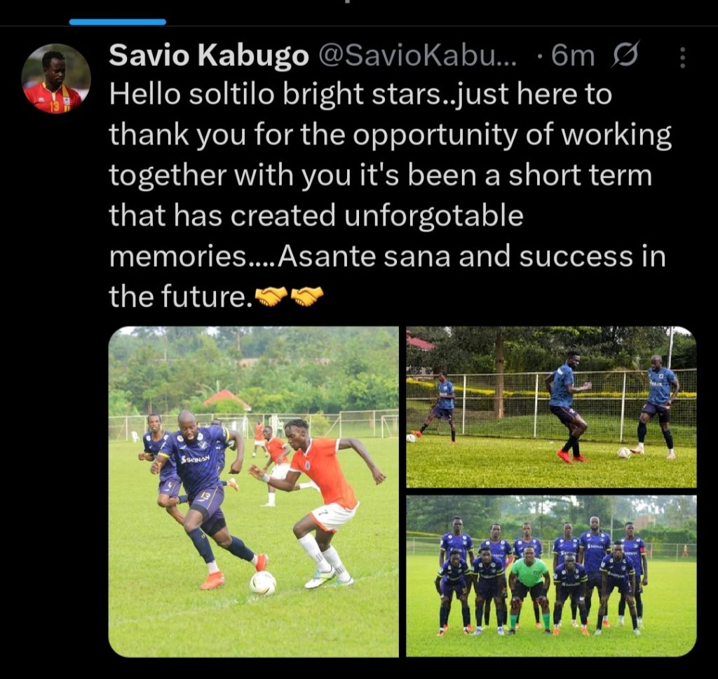 Former Uganda Cranes defender Savio Kabugo has officially bid farewell to Soltilo Bright Stars FC, marking the end of a brief but memorable stint with the club. In a heartfelt message on his X account, Kabugo expressed his gratitude to the team, saying, “Hello Soltilo Bright Stars..just here to thank you for the opportunity of working together with you it’s been a short term that has created unforgettable memories….Asante sana and success in the future.” 🤝🤝