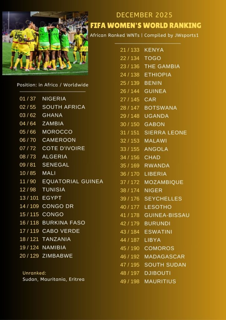 Globally, Spain retains its top spot, followed closely by the United States, Germany, England, and Sweden. The latest rankings have seen Germany rise two places, while Sweden dropped to fifth. Nigeria, Africa’s top-ranked team, dropped one place but remains the continent’s leader. A record 198 teams are now part of the rankings, with Chad and Libya making their first appearance.