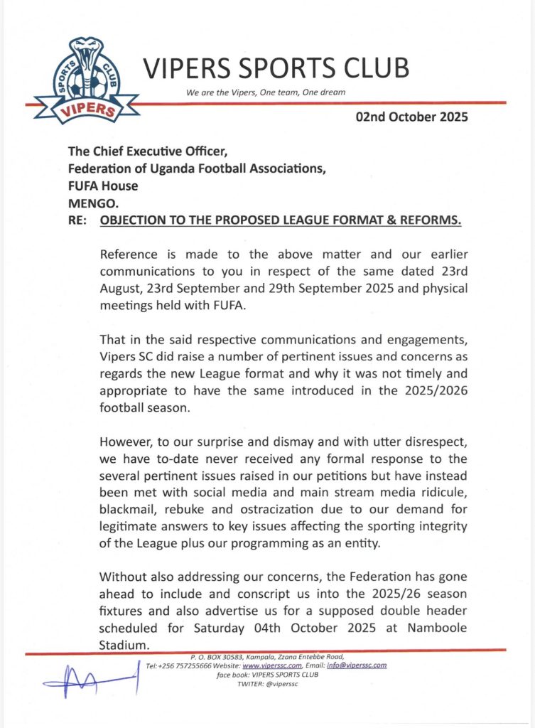 In light of these concerns touching on the integrity of the game and posing an existential threat to Vipers SC as a football entity, the club has decided not to participate in the match or any further engagements in the new league format until these issues are formally addressed and resolved by the Federation of Uganda Football Associations (FUFA).