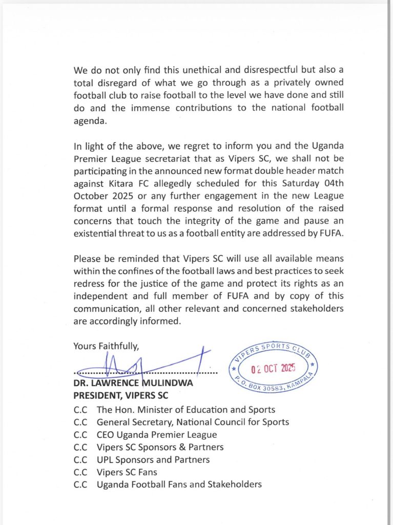 The letter was copied to several stakeholders including the Hon. Minister of Education and Sports, the General Secretary of the National Council for Sports, the CEO of Uganda Premier League, Vipers SC sponsors and partners, UPL sponsors and partners, Vipers SC fans, and Uganda football fans and stakeholders.
